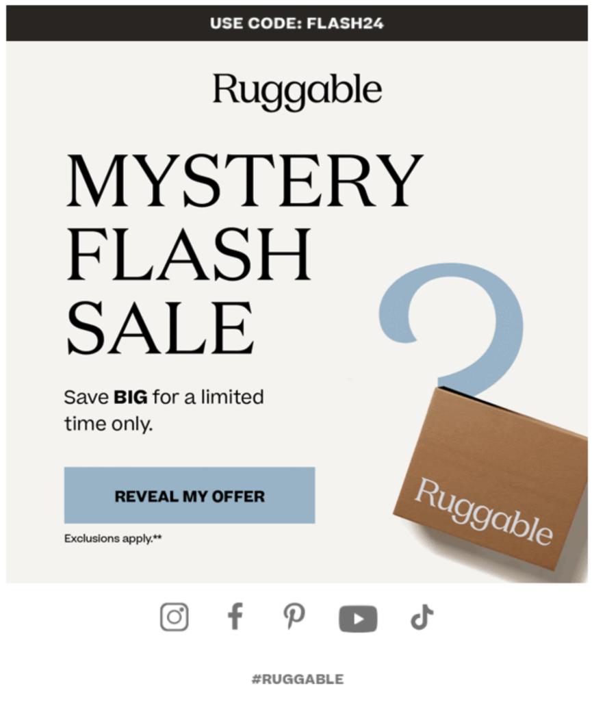 Ruggable recently ran a mystery flash sale marketing campaign, creating a sense of urgency as individuals fear missing out on the opportunity if they don’t act quickly. The “mystery” part of the sale adds another layer of FOMO as consumers are enticed to access an exclusive event that is unavailable to the public. Finally, not disclosing the offer’s details piques the consumer’s interest a    nd entices them to click and learn more.