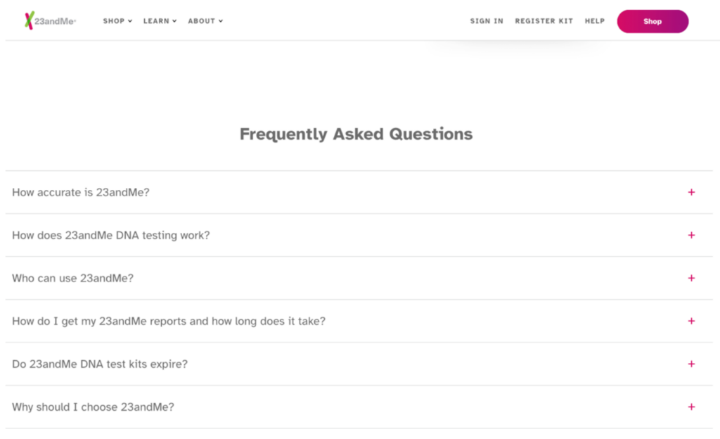 Another great way to educate consumers is to include a FAQ section on the homepage. 23andme does this flawlessly by including the six most frequently asked questions towards the bottom of the homepage. If the shopper has scrolled all the way to the bottom of the homepage, it’s likely they have not found what they are looking for, so why not include answers to shopper’s most frequently asked questions?