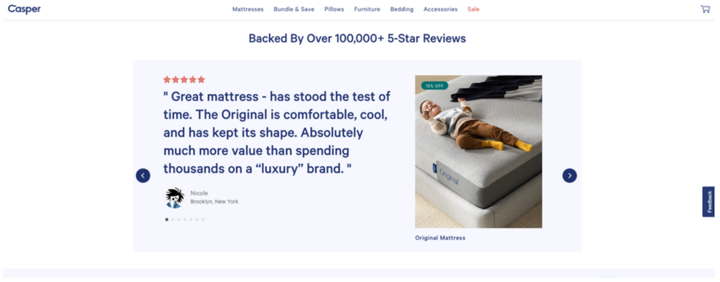 Casper nails this on their homepage with glowing testimonials from actual customers. In addition to featuring the testimonial, we love the strong headline that touts over 100,000 5-Star Reviews.