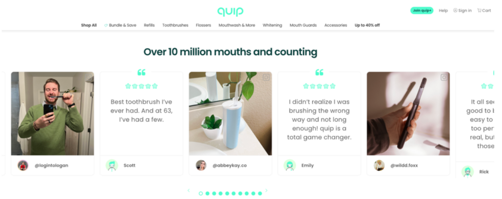 Quip, an oral care company with toothbrushes, flossers, and more, does a great job of featuring testimonials, too. What we love about this testimonial section is that it features real reviews from social media, as you can see the user’s social media handle and profile image under the testimonial. The “10 million mouths and counting” is a nice touch, too.