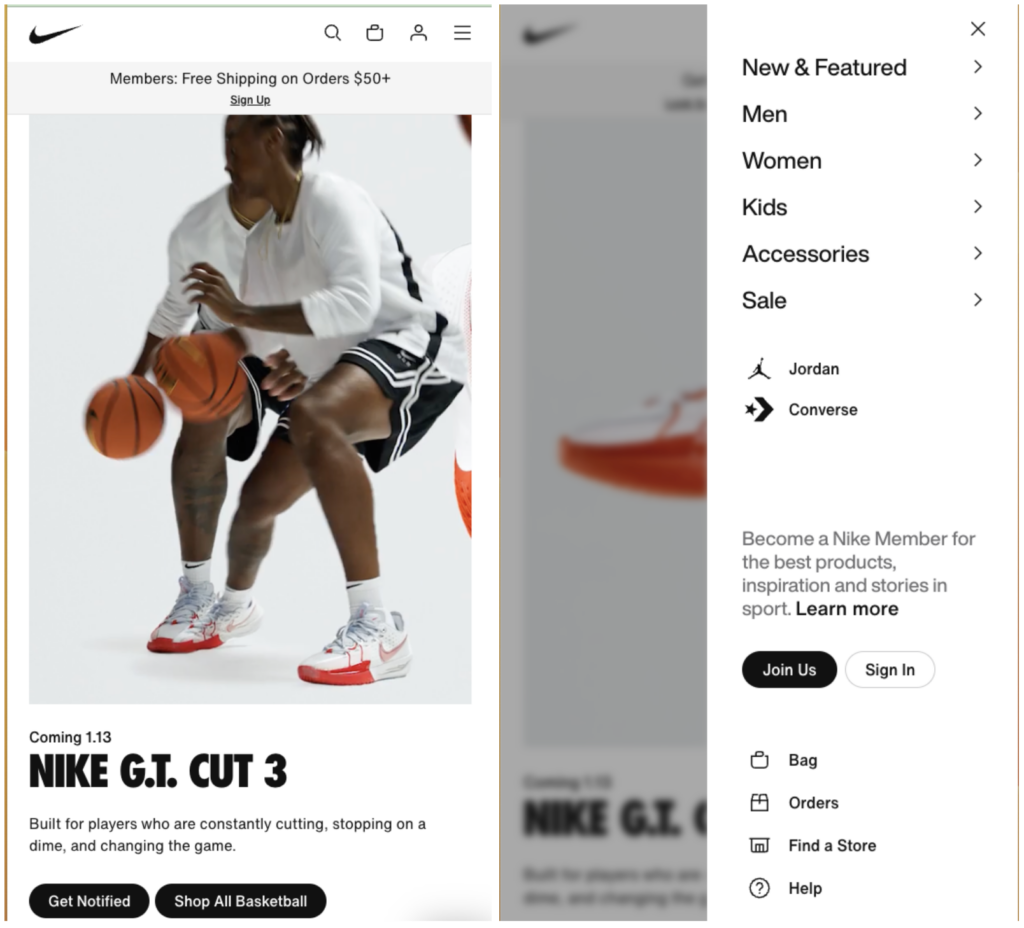 Nike’s mobile site is shown above – the image on the left is before clicking and on the right is after clicking on the menu. They utilize a hamburger menu (the three horizontal lines in the right-hand corner) that expands to allow the shopper to view more. The great thing about the hamburger menu is that it maximizes the site’s real estate. Shoppers can quickly expose and hide a menu to find exactly what they are looking for.