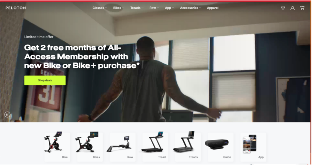 Peloton, a popular fitness equipment brand, has an impressive video header on its website, too. The engaging video showcases a person working out on their popular exercise bike and pairs it with a strong limited-time offer for two free months of all-access membership with a new bike purchase. The strategically placed call-to-action button, highlighted in a bright green, ensures it grabs the users attention, enticing them to take advantage of the offer.