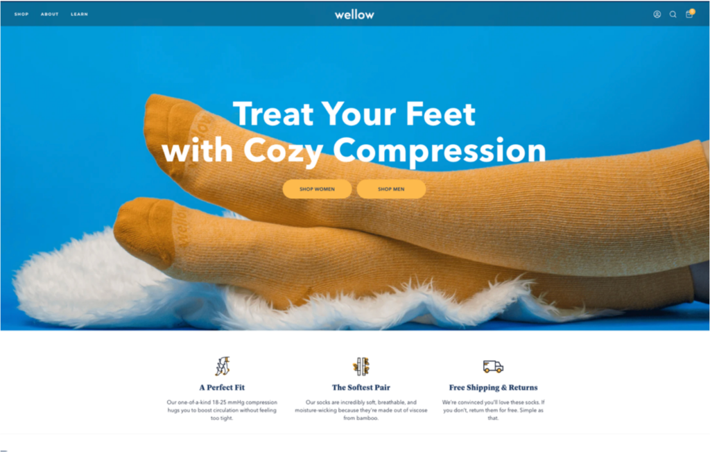 At Wellow, a Function Growth owned and operated direct-to-consumer compression sock brand, we carefully selected three reasons to believe and strategically positioned them directly below the header. To make them stand out, we incorporated on-brand icons that visually represent each benefit. The placement, coupled with a striking product header image, effectively associates the RTBs with the product in the shopper’s mind.